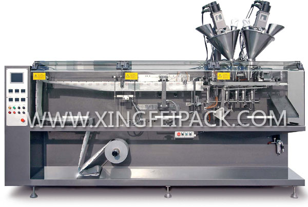 全自動水平式包裝機是一款水平式全自動卷膜成型袋包裝機,是集制袋、計量、灌裝、封口于一體的全新自動包裝機。以熱封性復合膜材料為外包裝,配置各種不同的灌裝頭,可對粉狀、顆粒、液體、粘稠體等不同的物料進行三邊封或四邊封包裝。